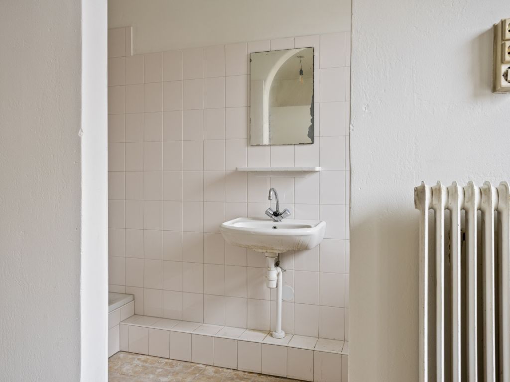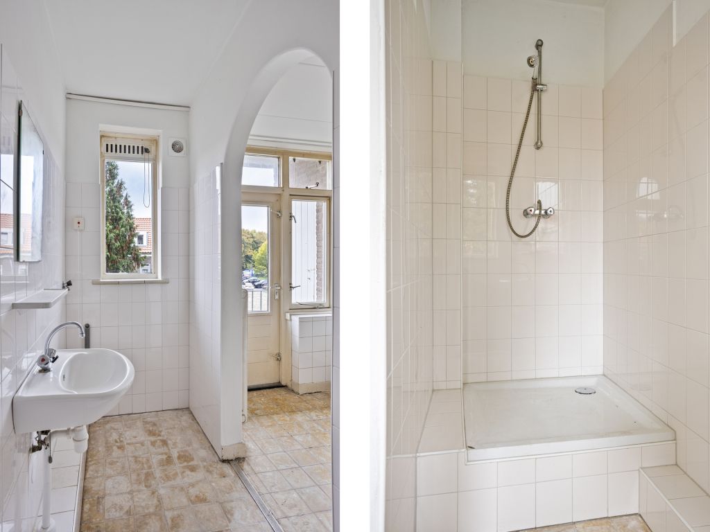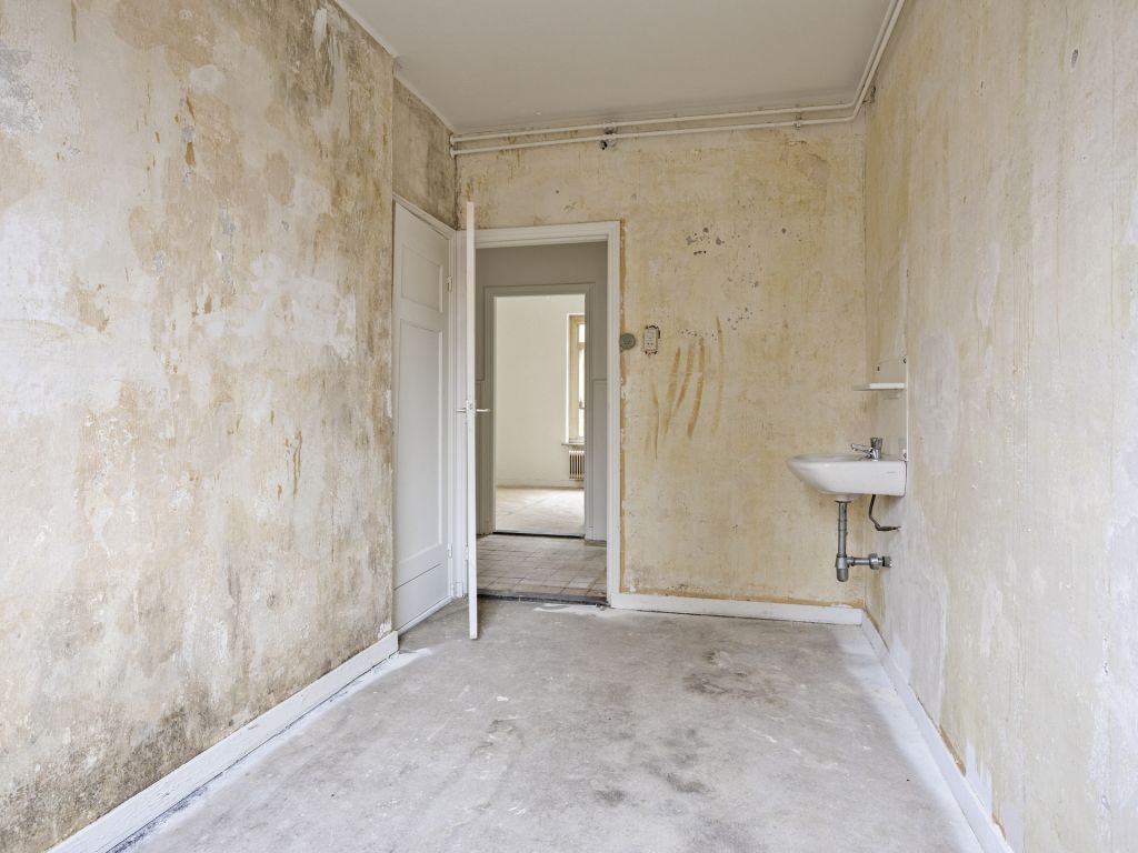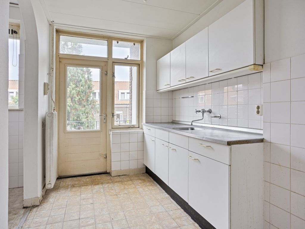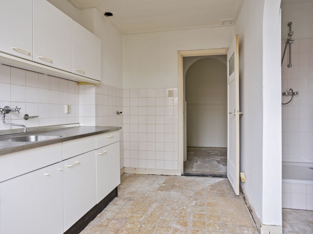 De dichte keuken is eenvoudig uitgevoerd met een wandmeubel en biedt toegang tot de badkamer met douche, wastafel en aansluiting voor wasapparatuur. Vanuit de keuken is ook het balkon op het noordwesten bereikbaar. Hier bevindt zich een bergkast met de CV-installatie.