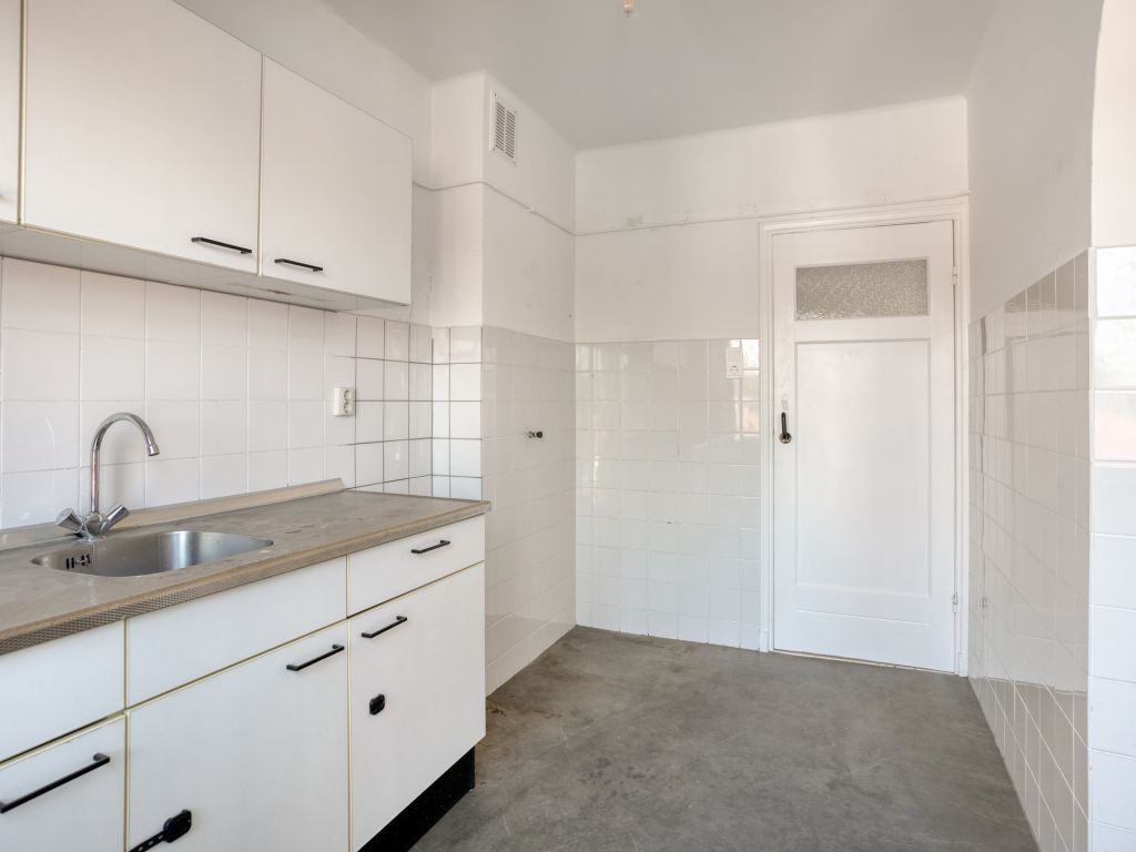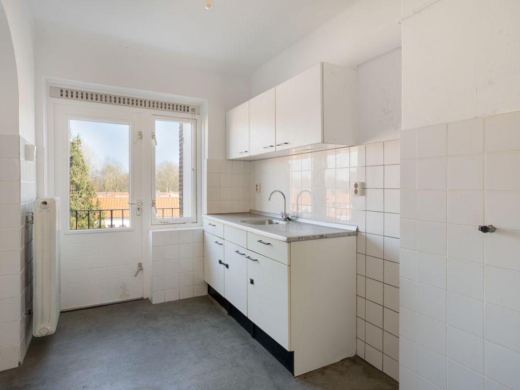 De dichte keuken is uitgevoerd met een eenvoudig keukenmeubel en geeft toegang tot het 2e balkon met een bergkast. Verder is er vanuit de keuken toegang tot de badkamer met een douche en een wastafel. Tevens bevinden zich hier de aansluitingen van de wasapparatuur. Van de twee slaapkamers in het appartement beschikt er een over een praktische inbouwkast. De 2e slaapkamer heeft een eigen wastafel. Beide slaapkamers liggen aan de achterzijde van het appartement.