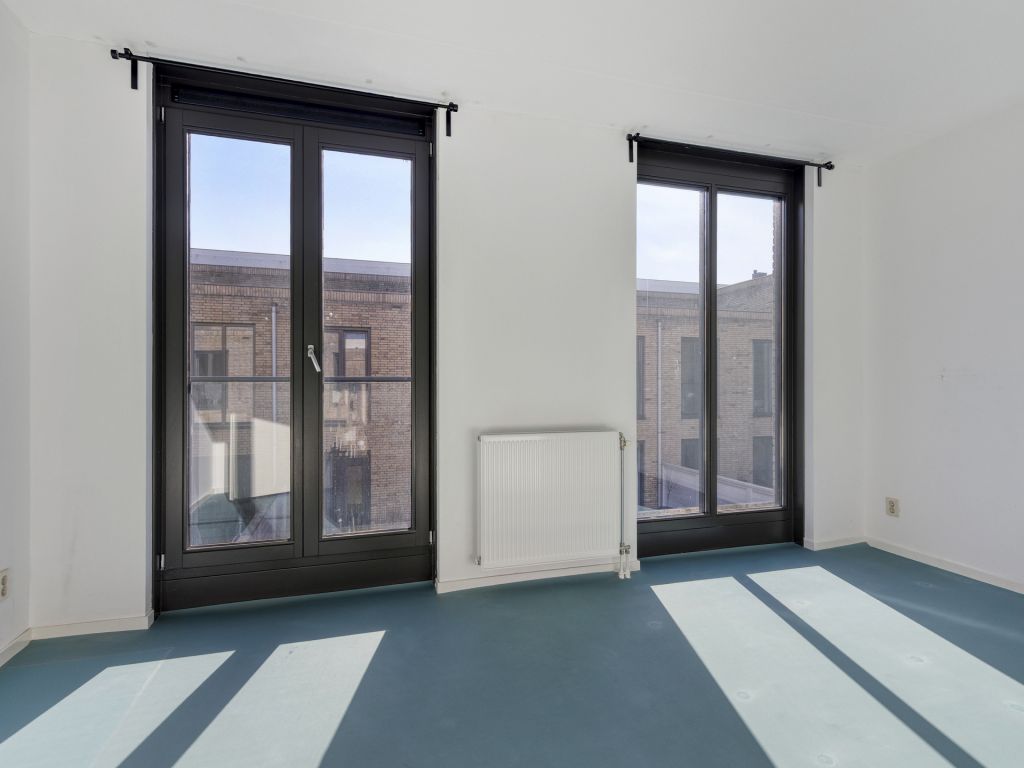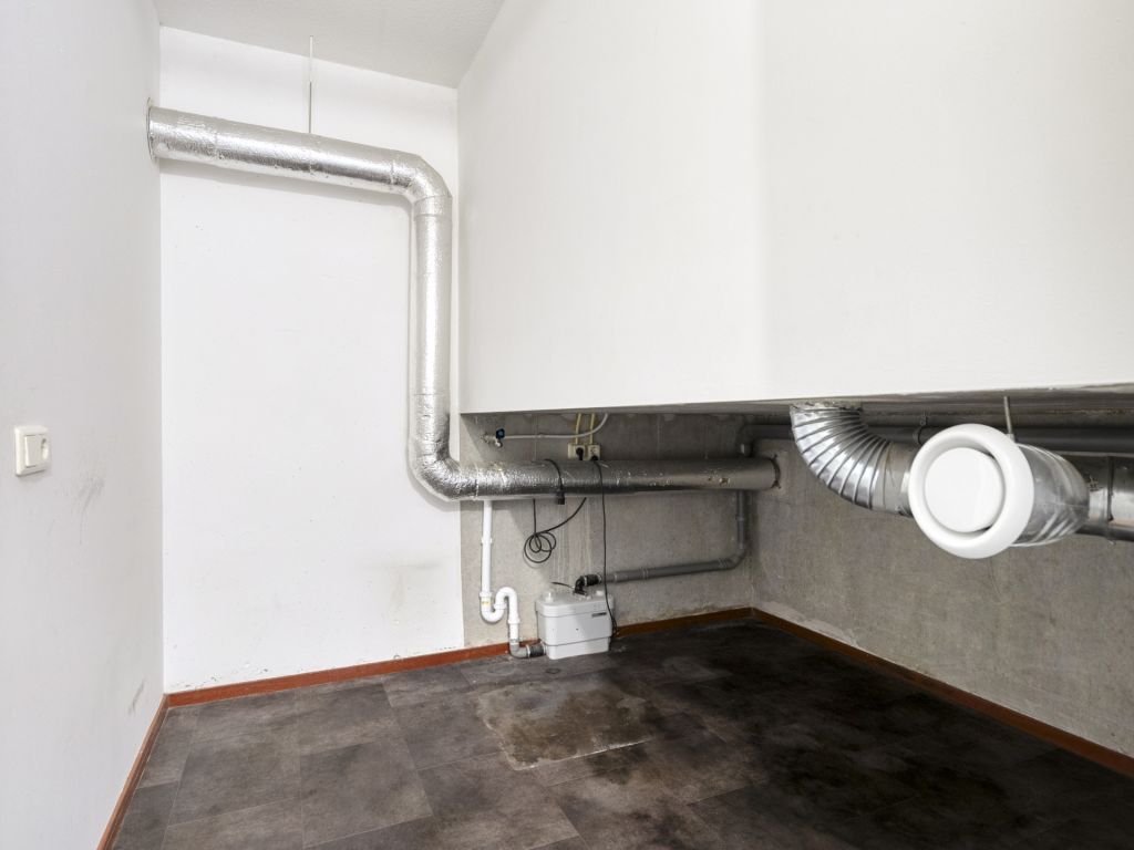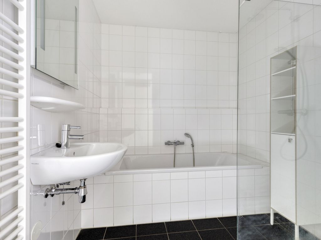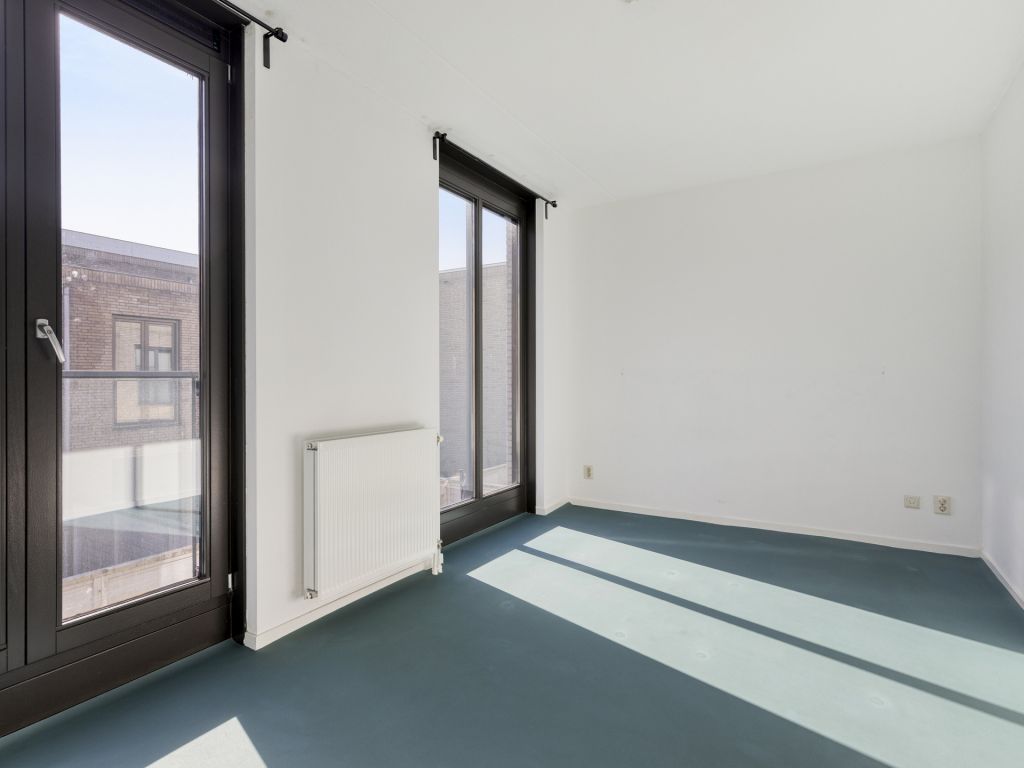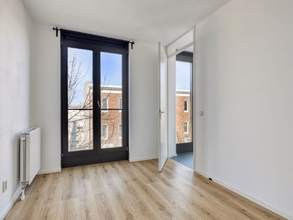 Via een kleine trap is de royale tweede slaapkamer bereikbaar, eveneens voorzien van een Frans balkon en een grote raampartij. Daarnaast bevindt zich hier een praktische bergkast met de cv-ketel en de wasmachineaansluiting.