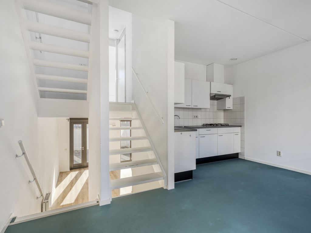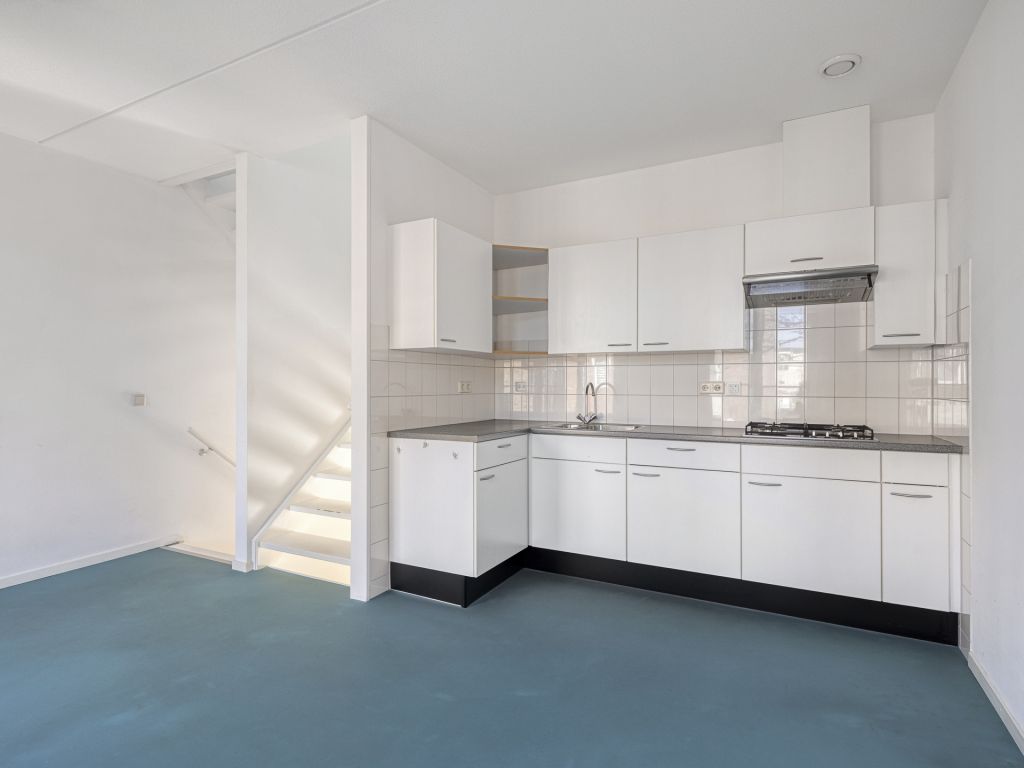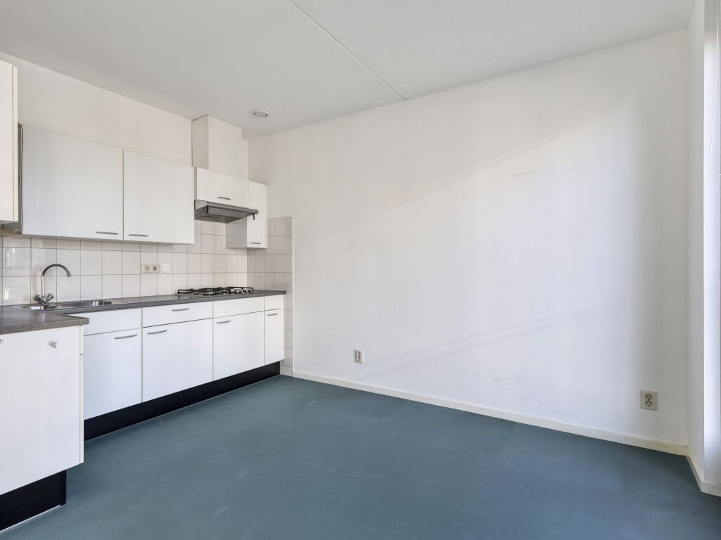 Via een kleine trap bereikt u de keuken in hoekopstelling. Dankzij het Franse balkon en de grote raampartij is dit een fijne, lichte plek met voldoende ruimte voor een eettafel.