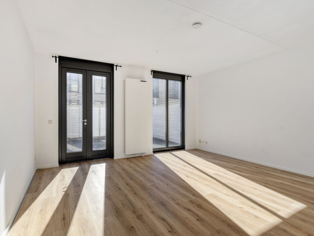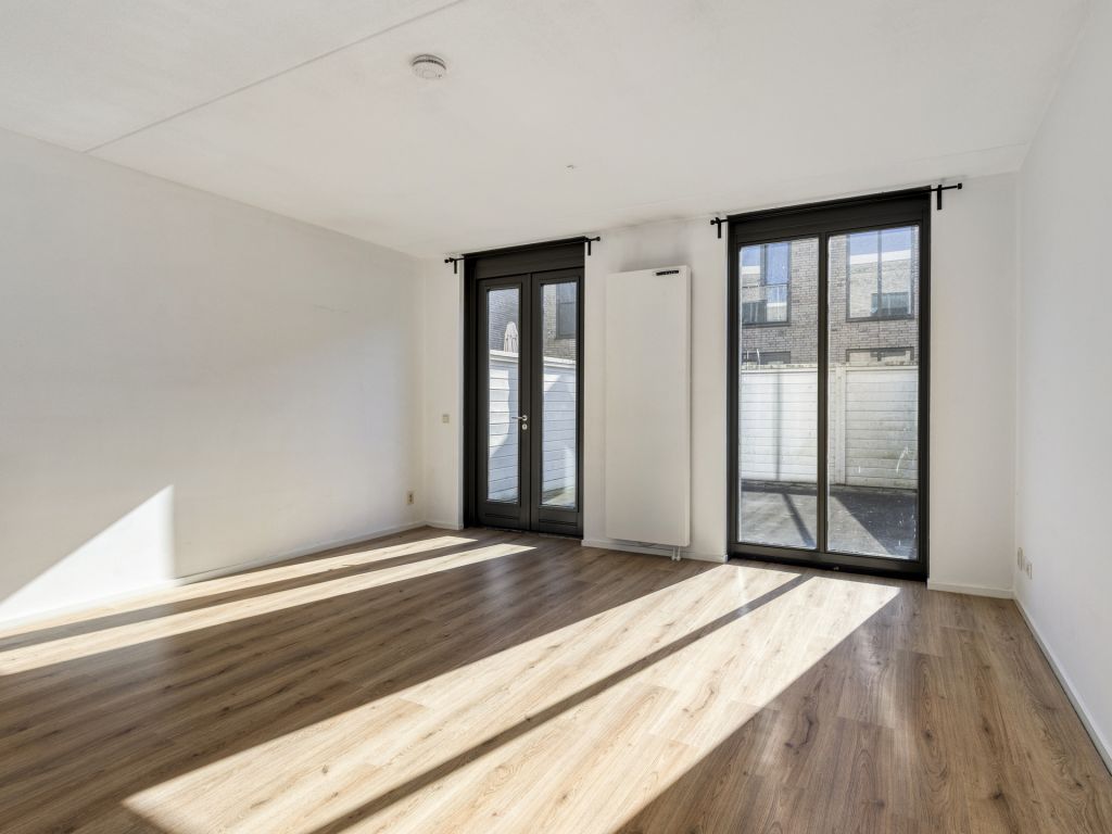 Via een klein hoogteverschil is de ruime woonkamer te bereiken met openslaande deuren naar de zonnige stadstuin gelegen op het zuiden. De woonkamer is voorzien van een nette laminaatvloer.