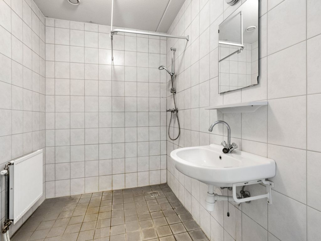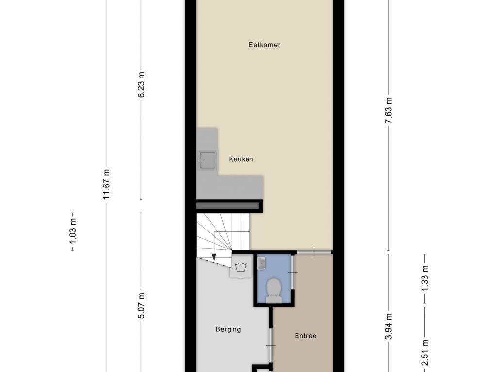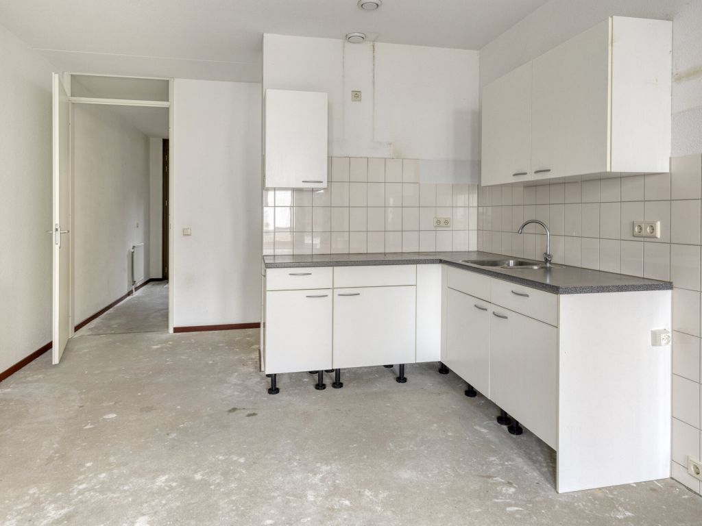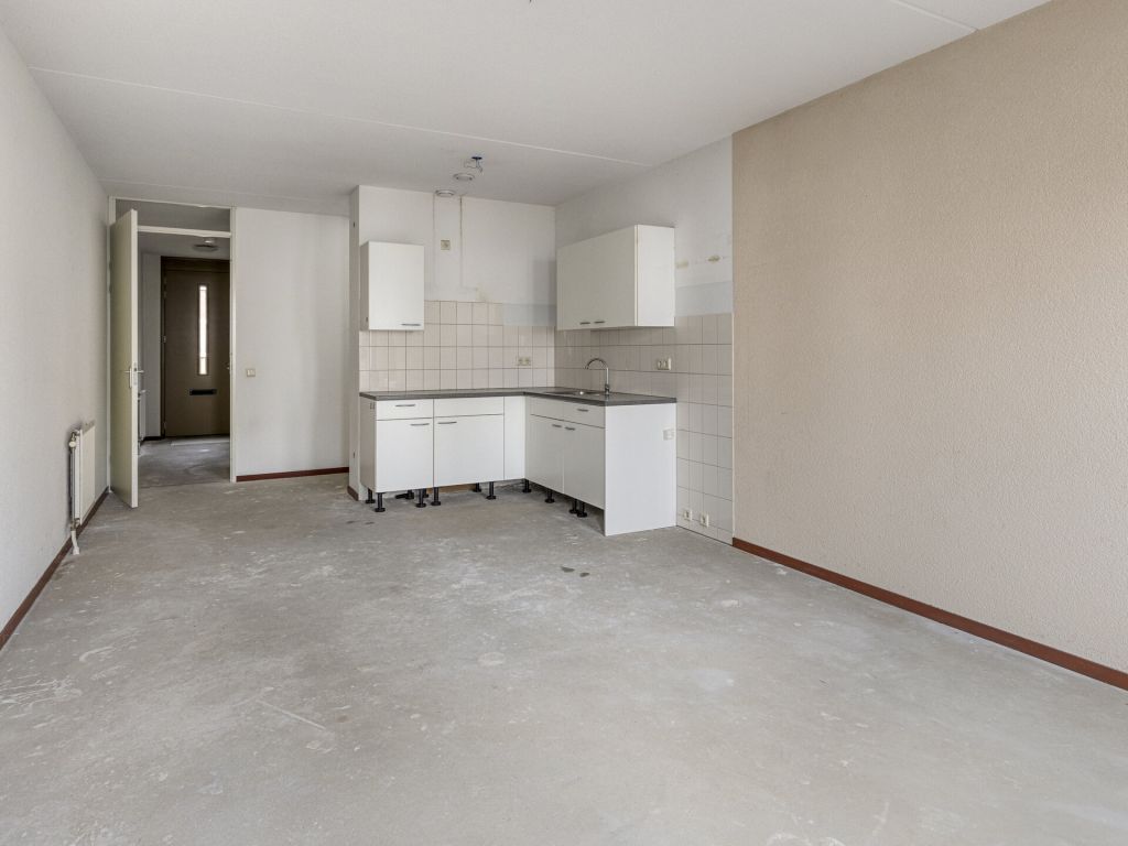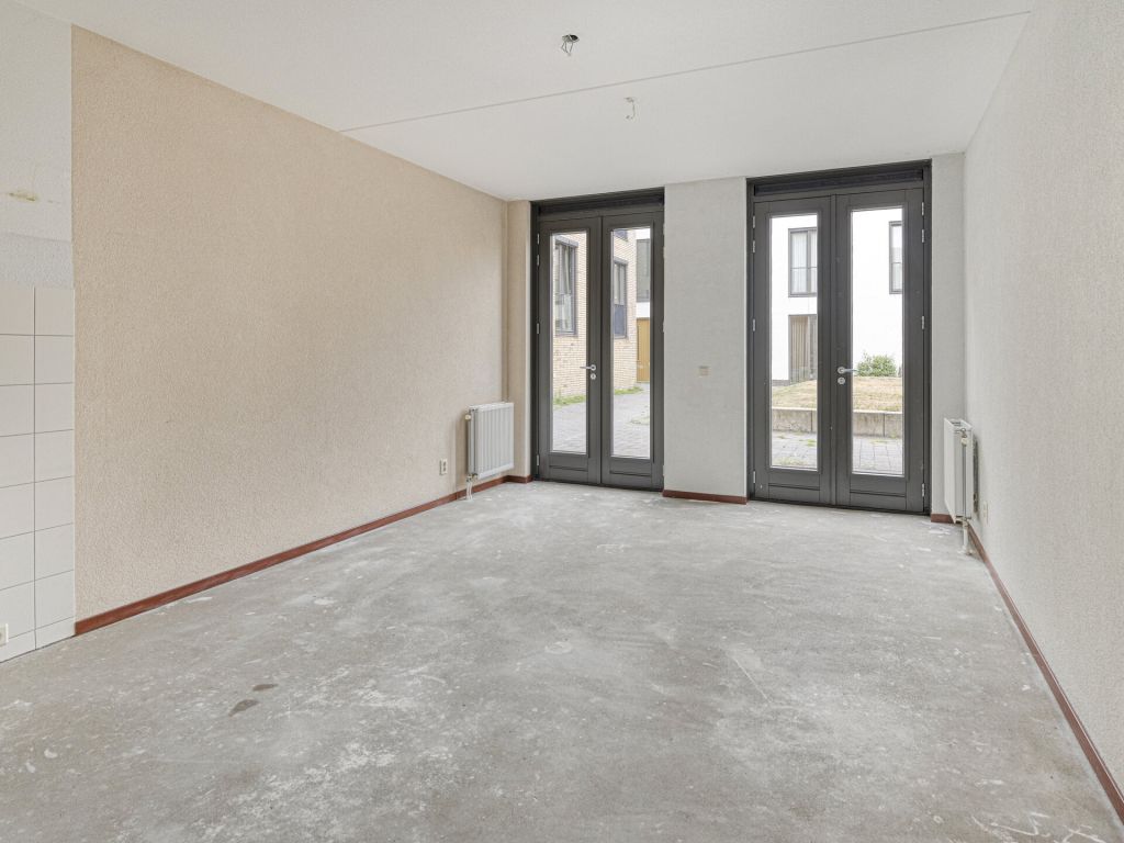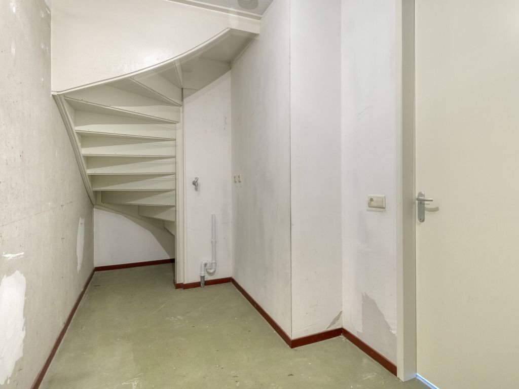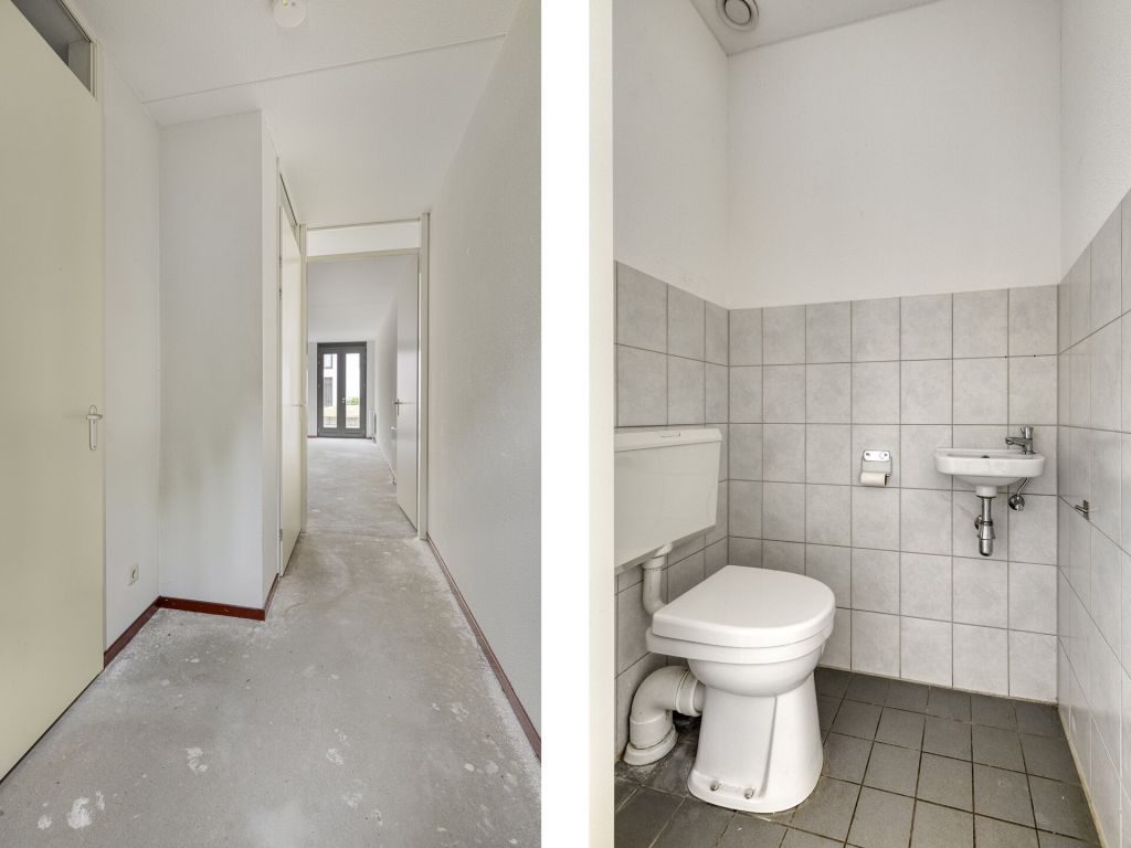 Vanuit de hal/entree is er toegang tot het toilet met fonteintje, meterkast, de inpandige berging (welke ook vanuit buiten bereikbaar is). In de berging bevindt zich de aansluiting voor de wasapparatuur. Vanuit de hal is er tevens toegang tot de royale eet-/woonkamer met hoge raampartijen van vloer tot plafond. De open keuken is voorzien van een eenvoudig keukenmeubel in hoek-opstelling.
