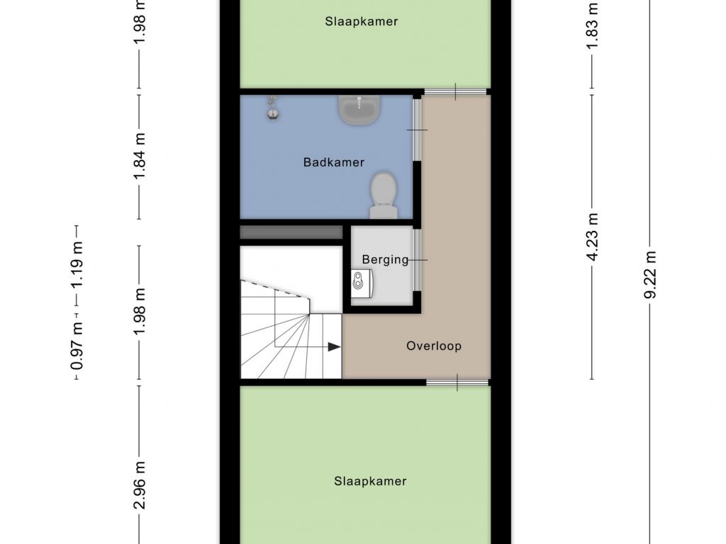 Overloop met aansluitend 2 fijne slaapkamers welke beide beschikken over een Frans balkon. De badkamer is voorzien van een douche, wastafel en een 2e toilet. Op de overloop bevindt zich een praktische bergkast waar zich de standplaats van de CV-ketel bevindt.
