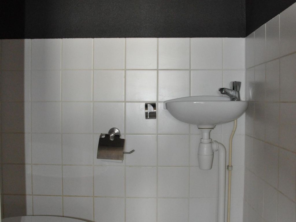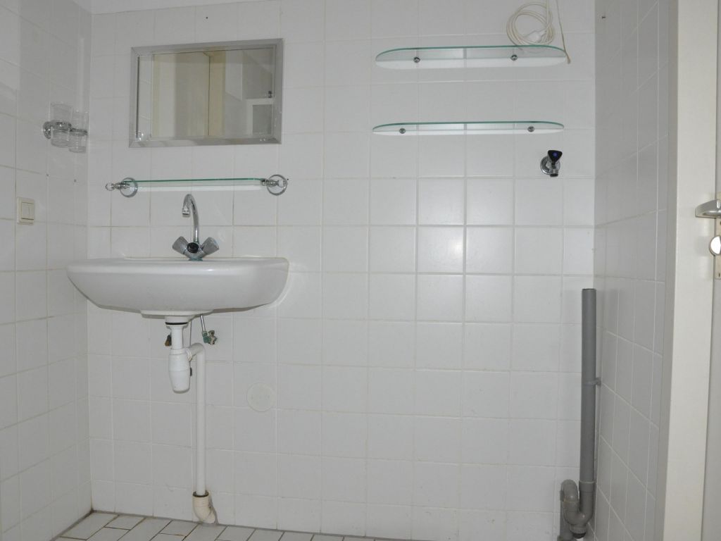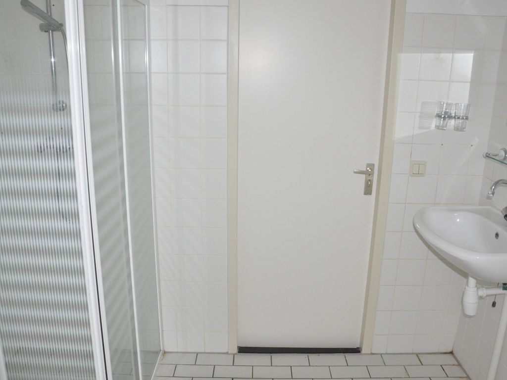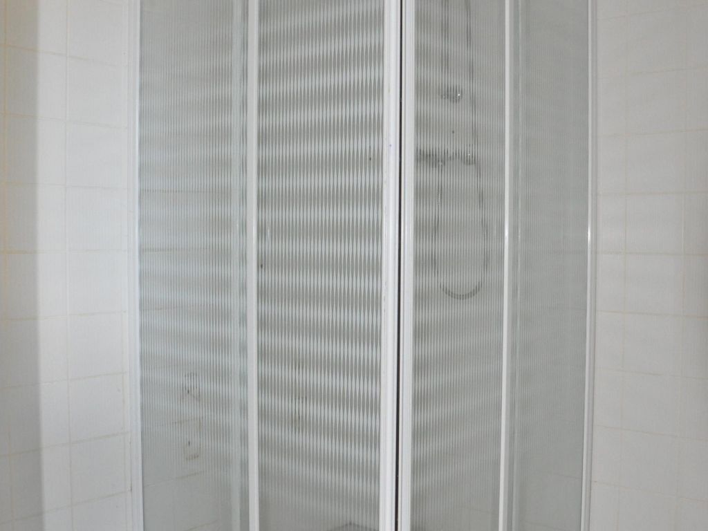 De hoofdslaapkamer is bereikbaar vanuit de woonkamer en heeft uitzicht op de patio. Deze ruime slaapkamer biedt voldoende plaats voor een tweepersoonsbed en een garderobekast. Via de slaapkamer bereik je de eenvoudige betegelde badkamer die is uitgerust met een douche en een wastafel. In deze ruimte bevindt zich tevens de aansluiting voor de wasmachine. Vanuit de woonkamer is daarnaast een portaal bereikbaar dat toegang geeft tot de badkamer en de toiletruimte. Het toilet is gedeeltelijk betegeld en voorzien van een fonteintje.