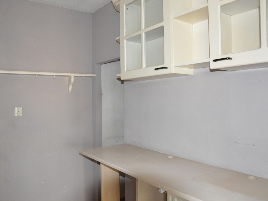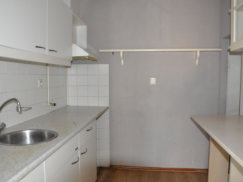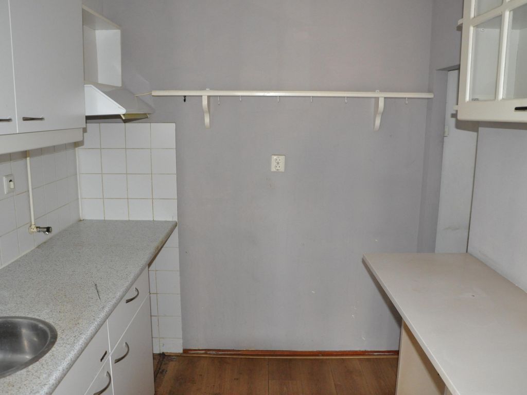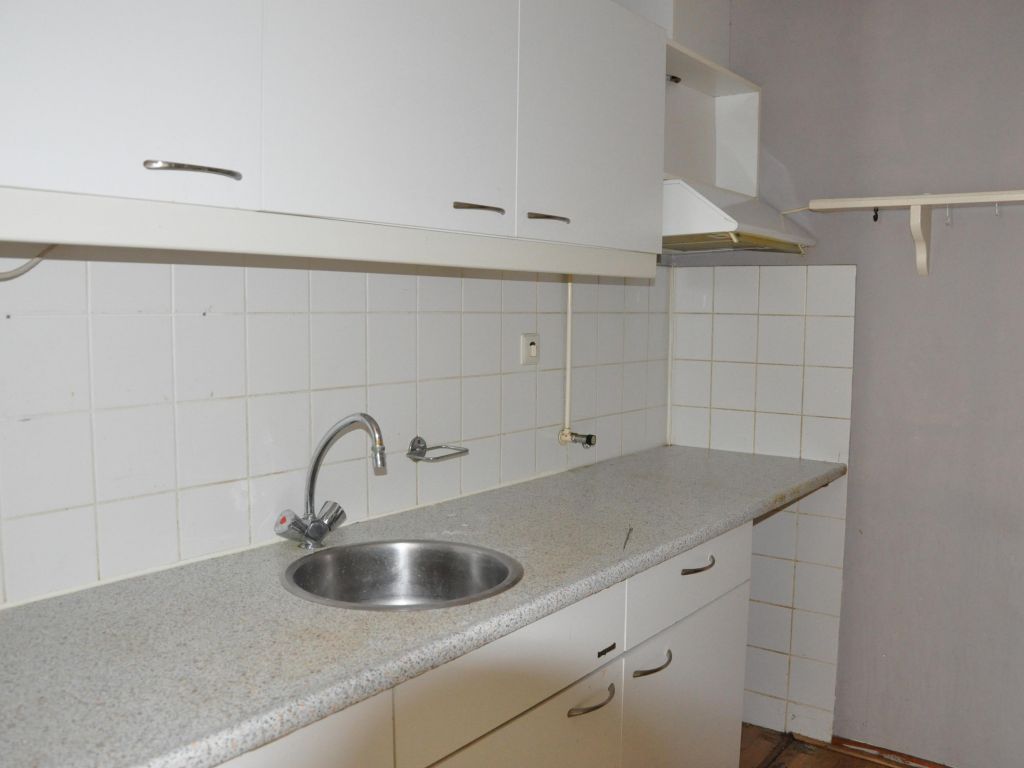 De keuken staat in open verbinding met de woonkamer, maar is enigszins uit het zicht geplaatst waardoor er toch een duidelijke scheiding tussen de ruimtes blijft. De keuken is uitgevoerd met een eenvoudig keukenblok in rechte opstelling met onder- en bovenkasten. Onder de trap bevindt zich een handige provisiekast die extra bergruimte biedt.