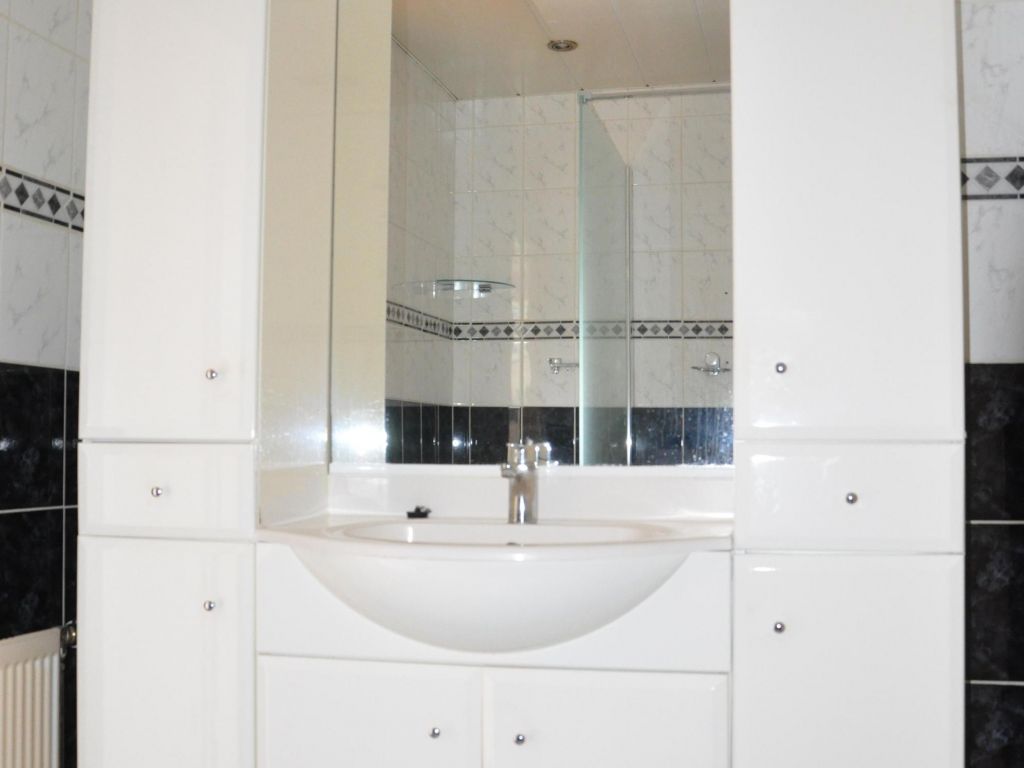 De hoofdslaapkamer is bereikbaar vanuit de woonkamer en heeft uitzicht op de patio. Deze ruime slaapkamer biedt voldoende plaats voor een tweepersoonsbed en een garderobekast en heeft een radiatorombouw en rolluik. Via de slaapkamer bereik je de betegelde badkamer die is uitgerust met een inloopdouche met glazen wand en een wastafel met een royaal meubel met veel bergruimte. Vanuit de woonkamer is daarnaast een portaal bereikbaar dat toegang geeft tot de badkamer en de toiletruimte. Het toilet is betegeld en voorzien van een fonteintje.
