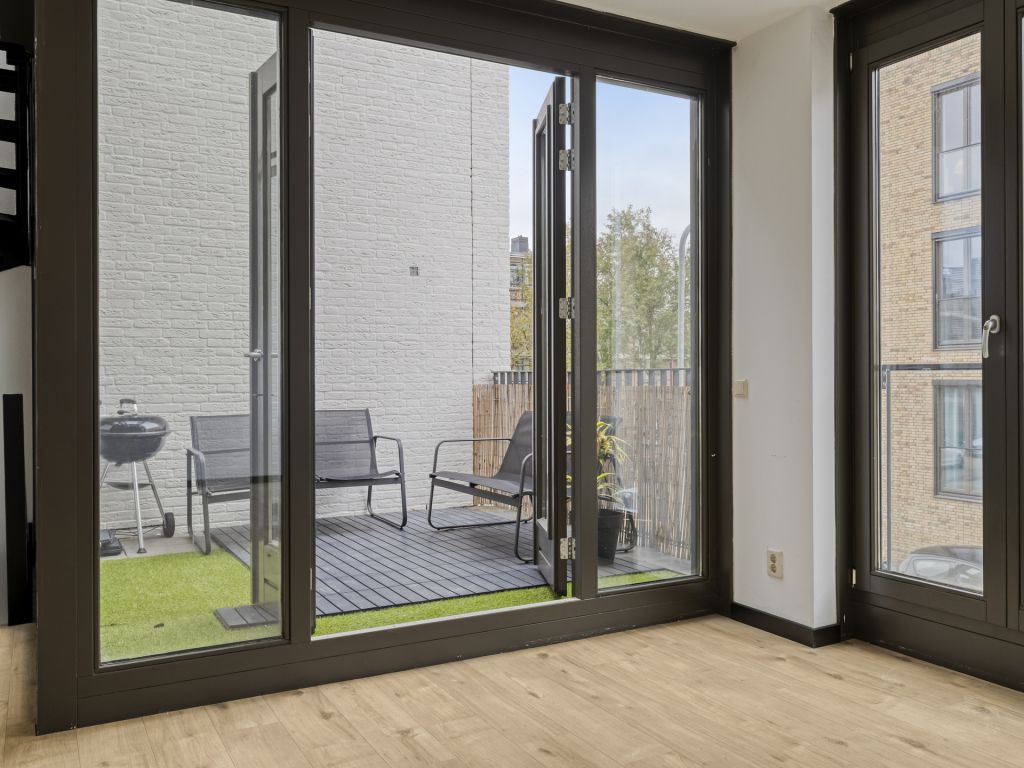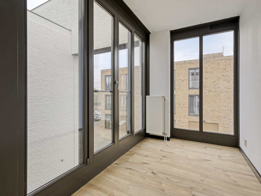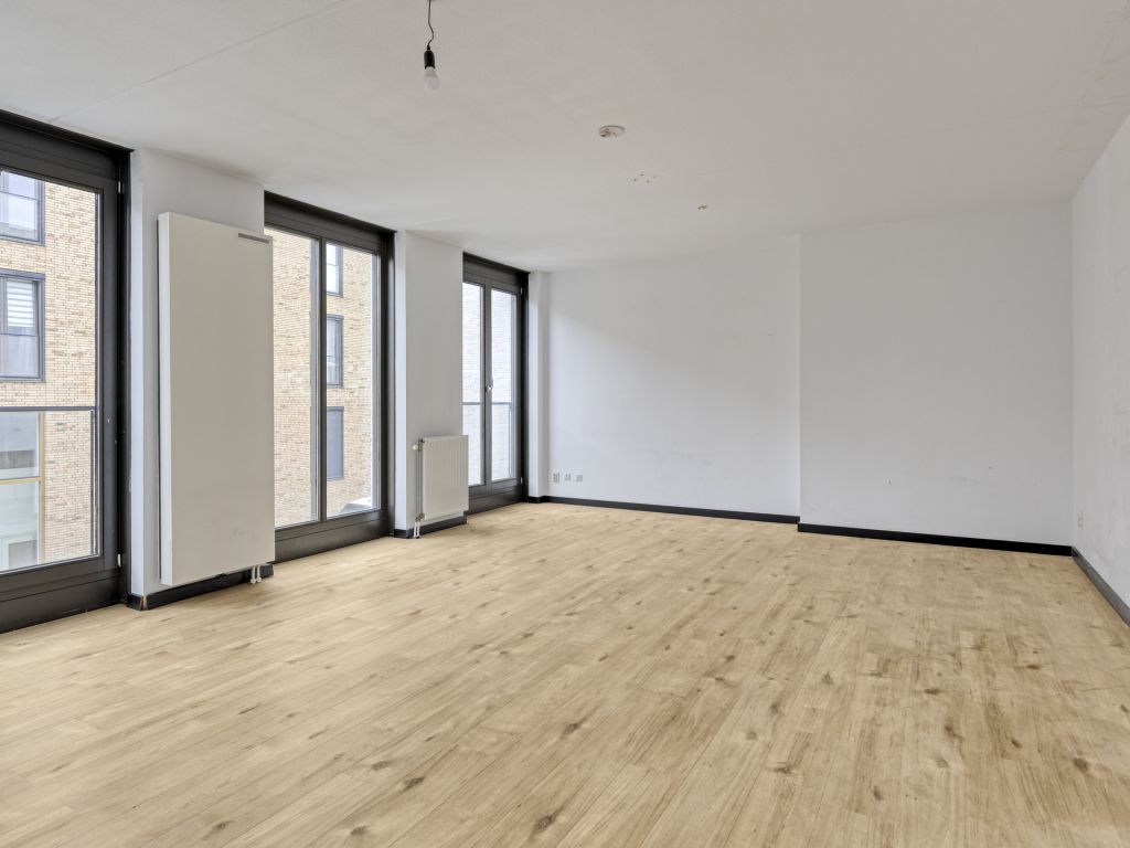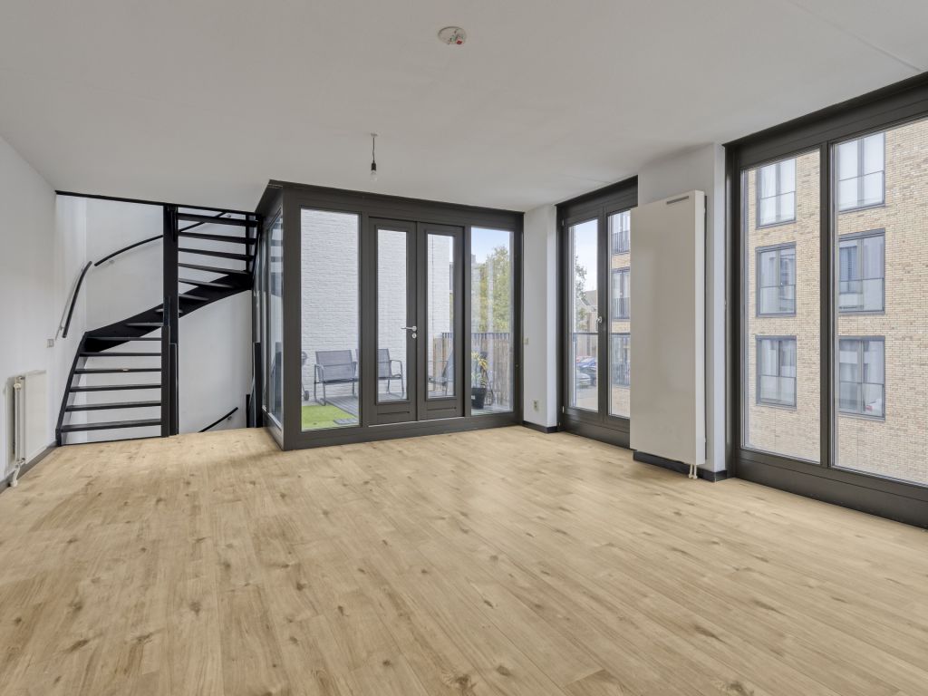 Middels de trap bereik je de ruime woonkamer met wederom hoge raampartijen van vloer tot plafond. Via de dubbele openslaande deuren in de woonkamer is het balkon (8 m²) bereikbaar, dat heerlijk op het westen is gesitueerd.