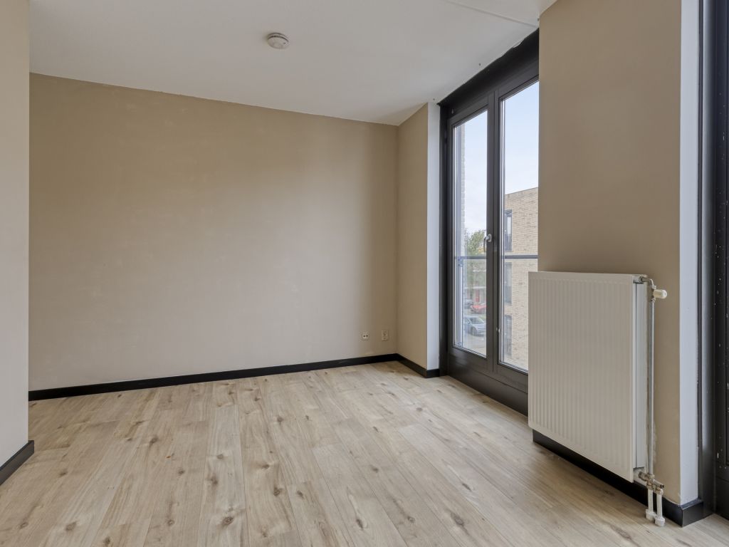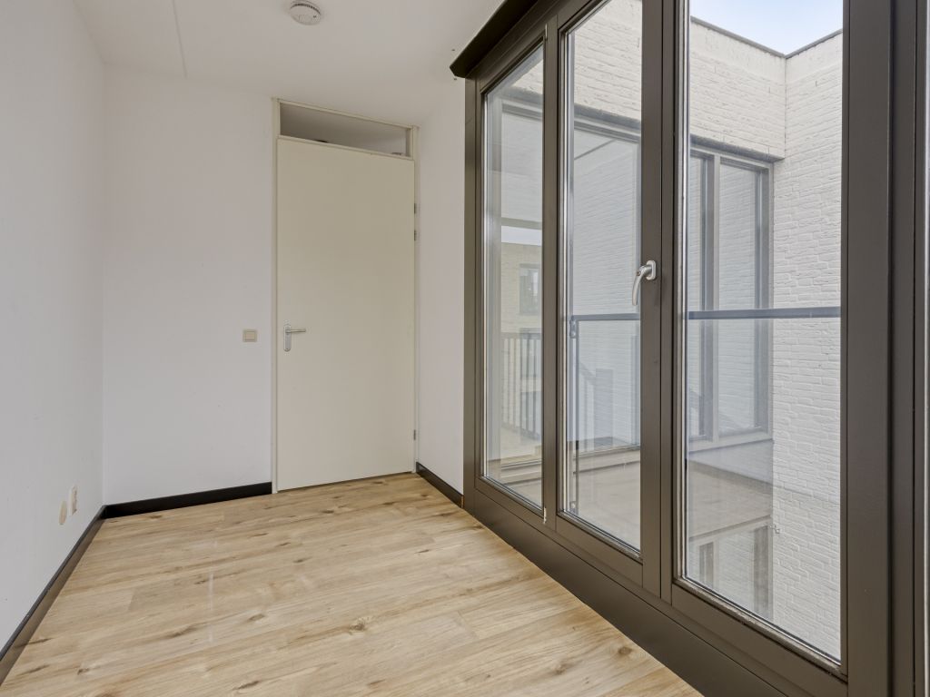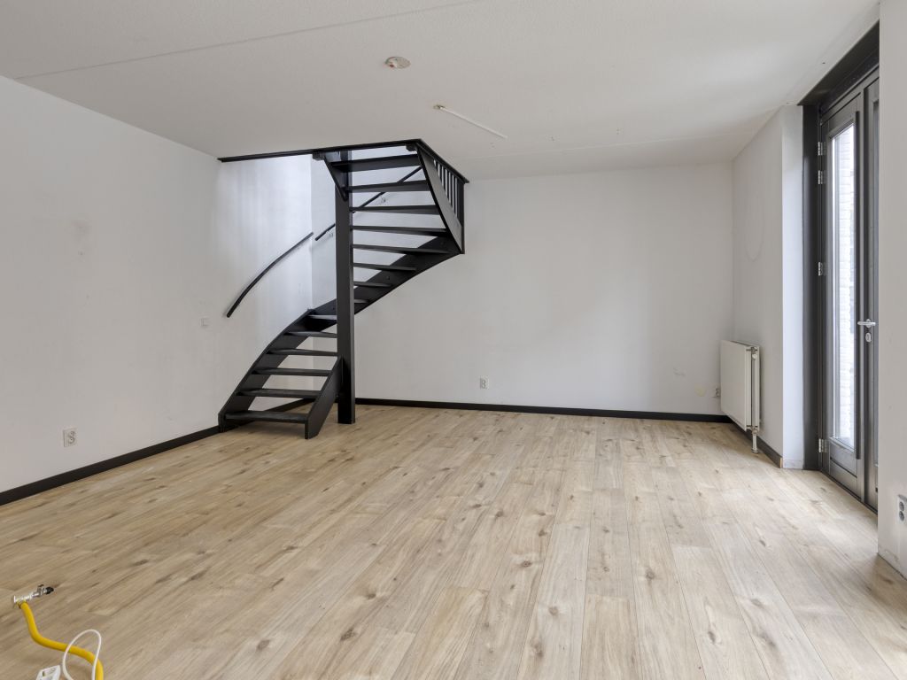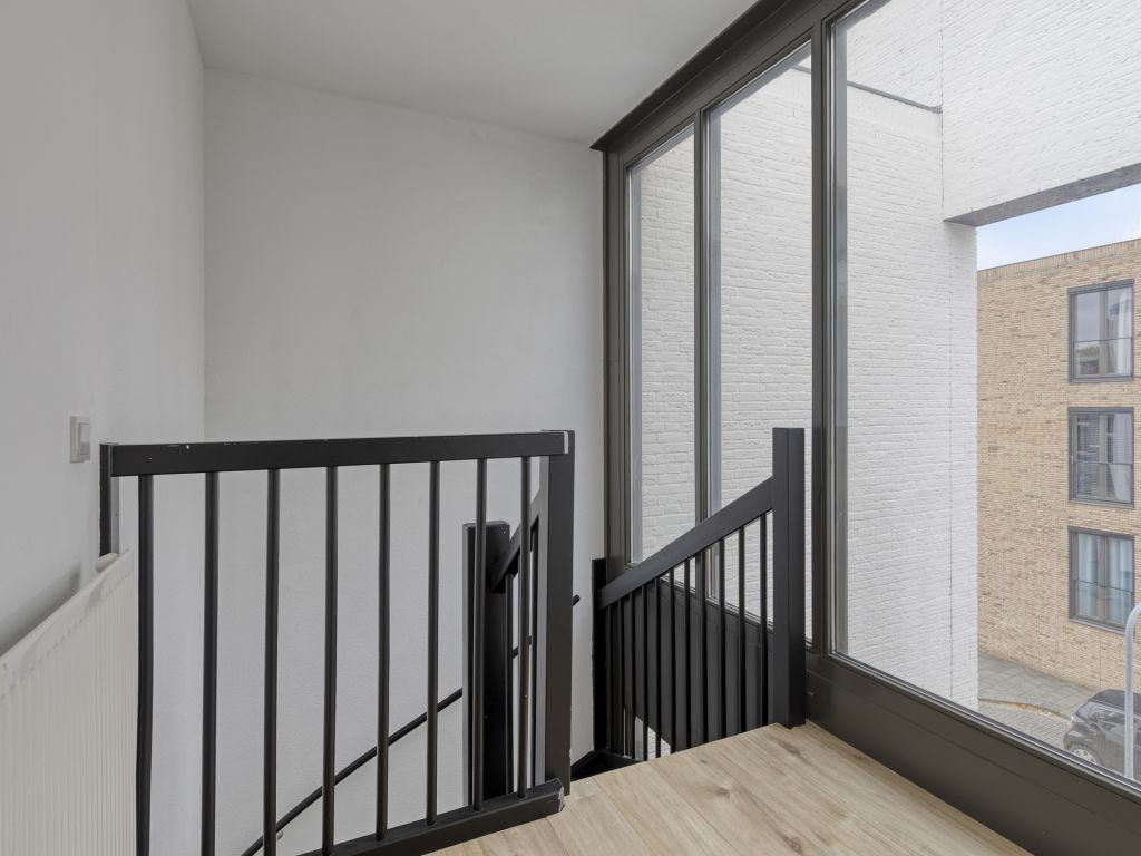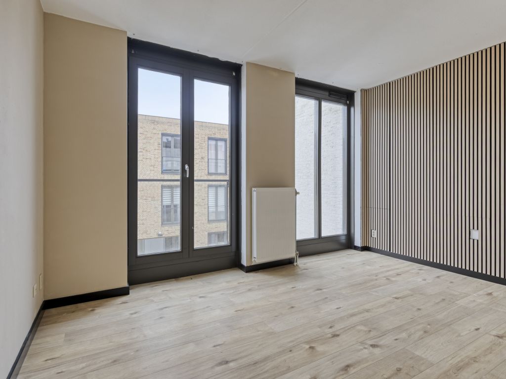 Middels de trap bereik je de ruime woonkamer met wederom hoge raampartijen van vloer tot plafond. Via de dubbele openslaande deuren in de woonkamer is het balkon (8 m²) bereikbaar, dat heerlijk op het westen is gesitueerd.