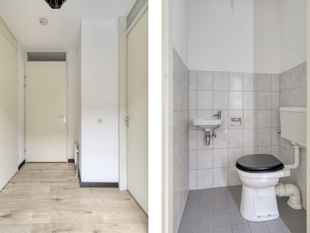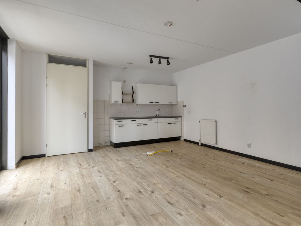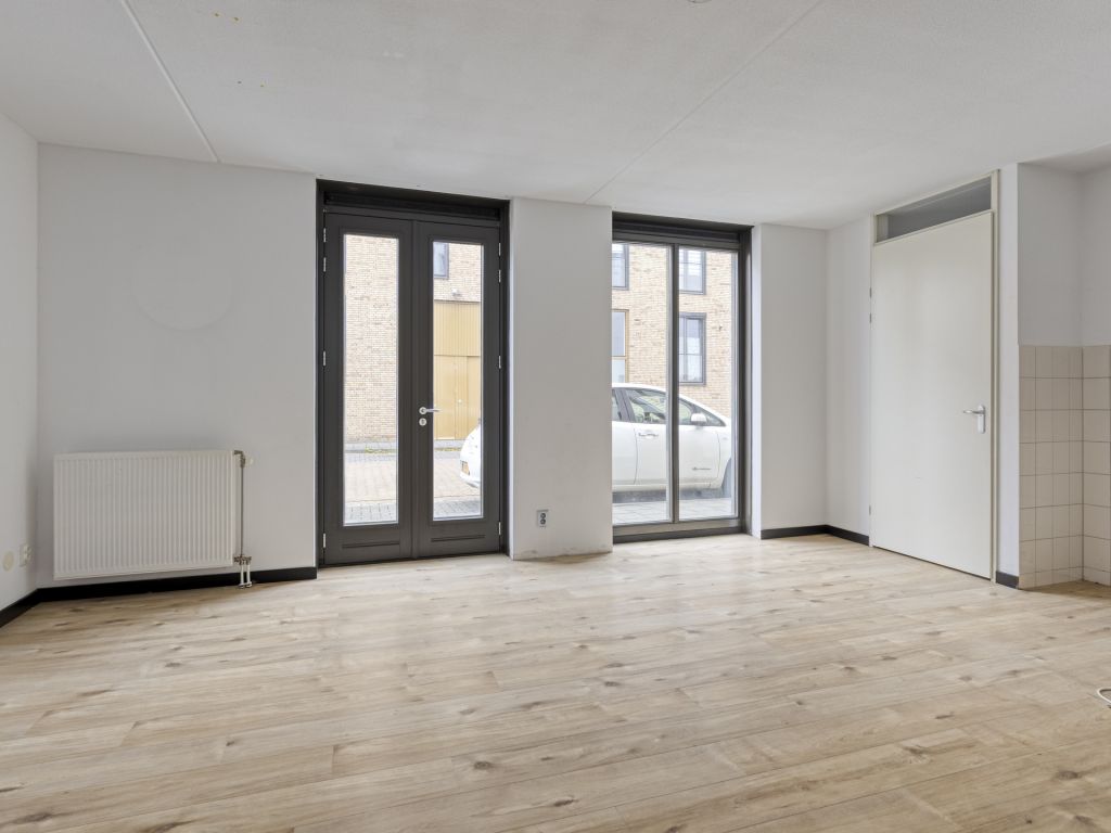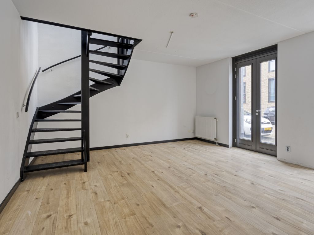 Vanuit de hal/entree is er toegang tot het toilet met fonteintje, meterkast, eet-/woonkamer en toegang tot de inpandige berging, waar zich de aansluiting voor de wasapparatuur en cv-ketel bevindt. De woonkamer beschikt over hoge raampartijen van vloer tot plafond en een nette laminaatvloer. De open keuken is voorzien van een eenvoudig keukenmeubel in rechte opstelling. Via de eet-/woonkamer is de 1e verdieping bereikbaar.