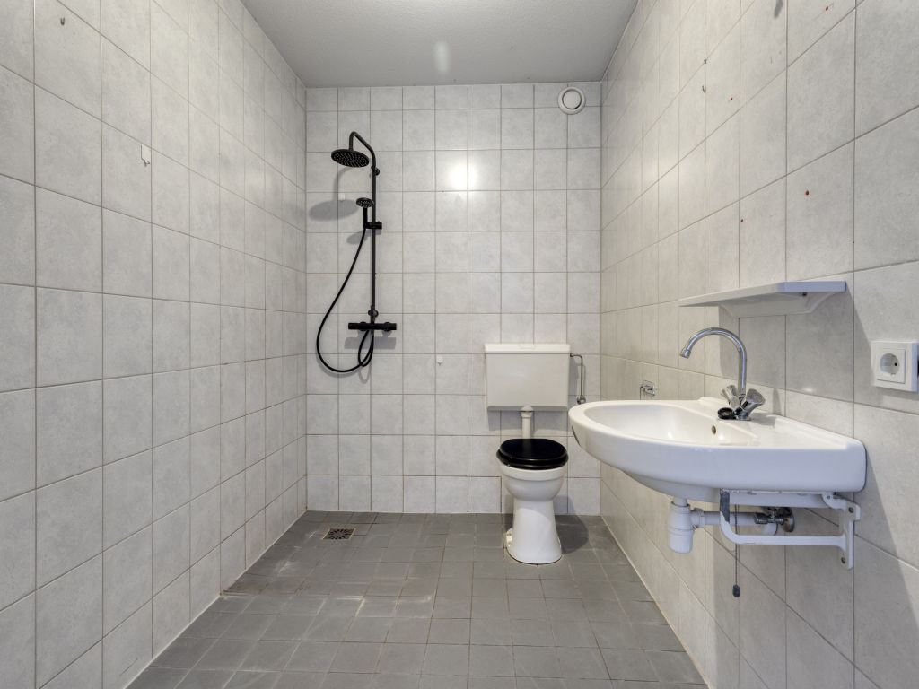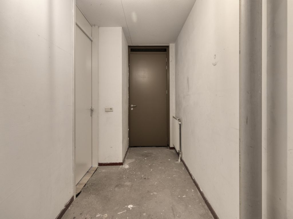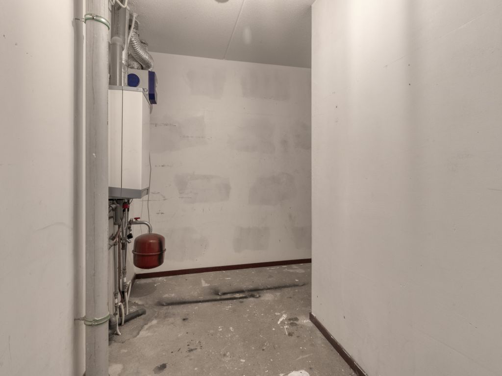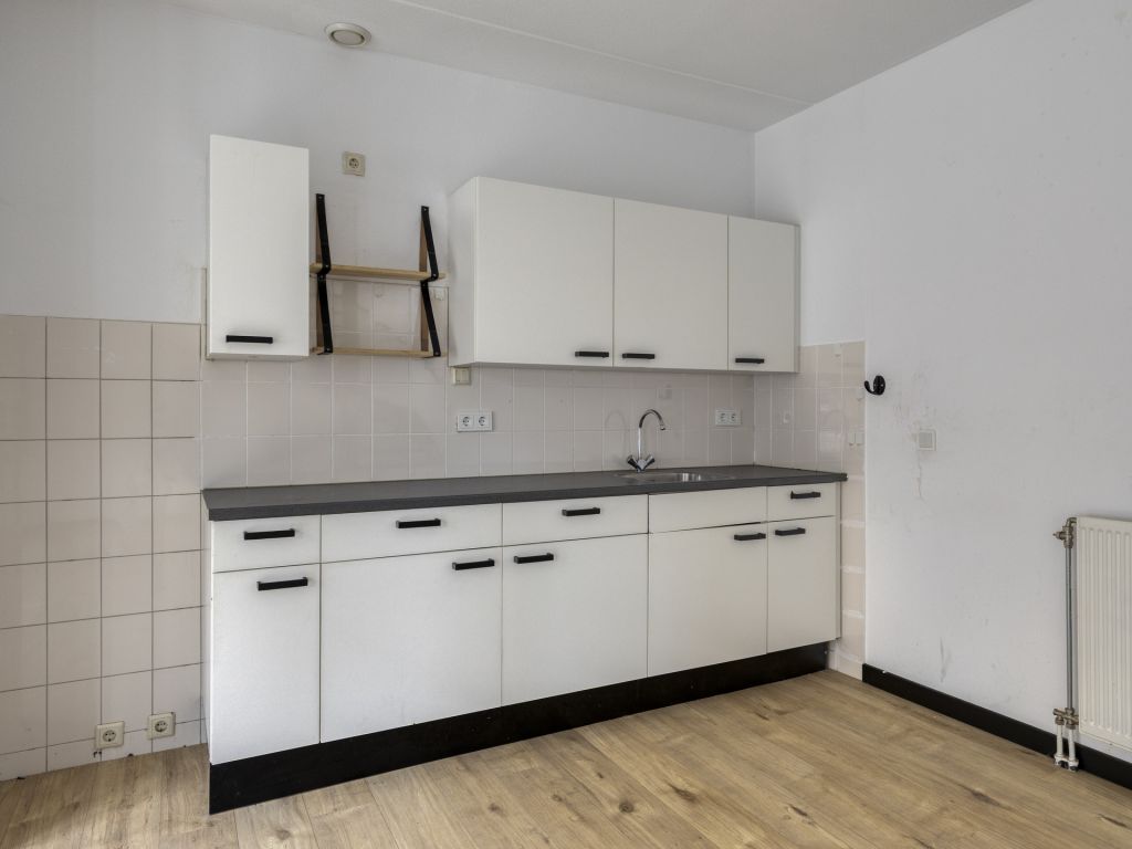 Vanuit de hal/entree is er toegang tot het toilet met fonteintje, meterkast, eet-/woonkamer en toegang tot de inpandige berging, waar zich de aansluiting voor de wasapparatuur en cv-ketel bevindt. De woonkamer beschikt over hoge raampartijen van vloer tot plafond en een nette laminaatvloer. De open keuken is voorzien van een eenvoudig keukenmeubel in rechte opstelling. Via de eet-/woonkamer is de 1e verdieping bereikbaar.