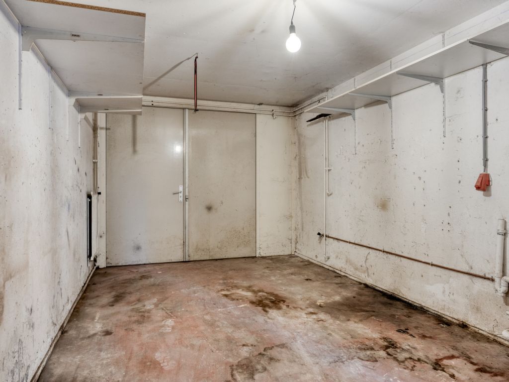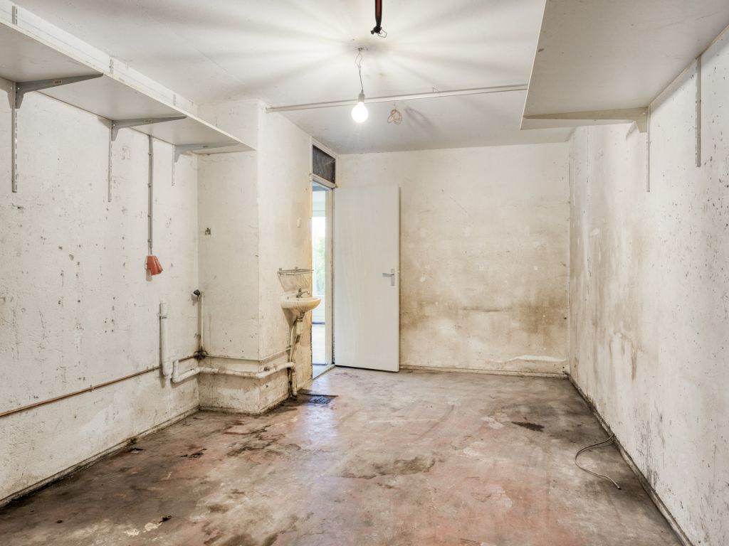De hal bij binnenkomst heeft een inpandige doorgang naar de ruime garage. De garage beschikt over een wastafel en de wasmachineaansluiting. Aan de tuinzijde bevindt zich een royale ruimte die bijvoorbeeld kan dienen als kantoor, slaapkamer, TV-kamer of bijvoorbeeld chillruimte. Een openslaande deur leidt vanuit hier naar de diepe tuin op het noordoosten.
